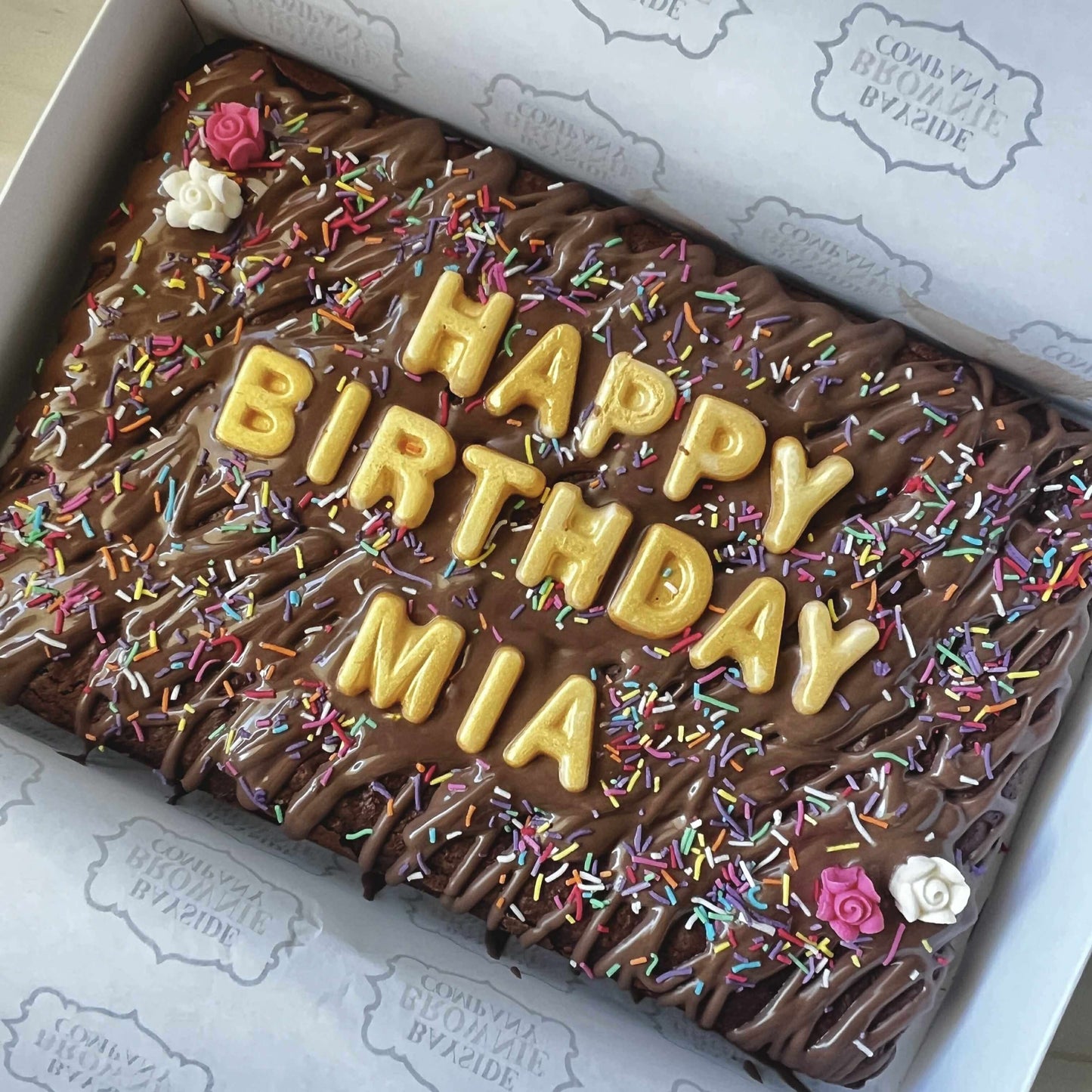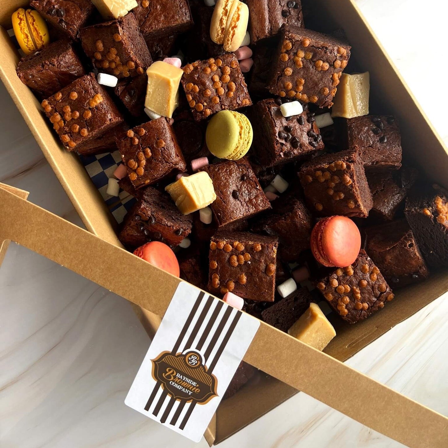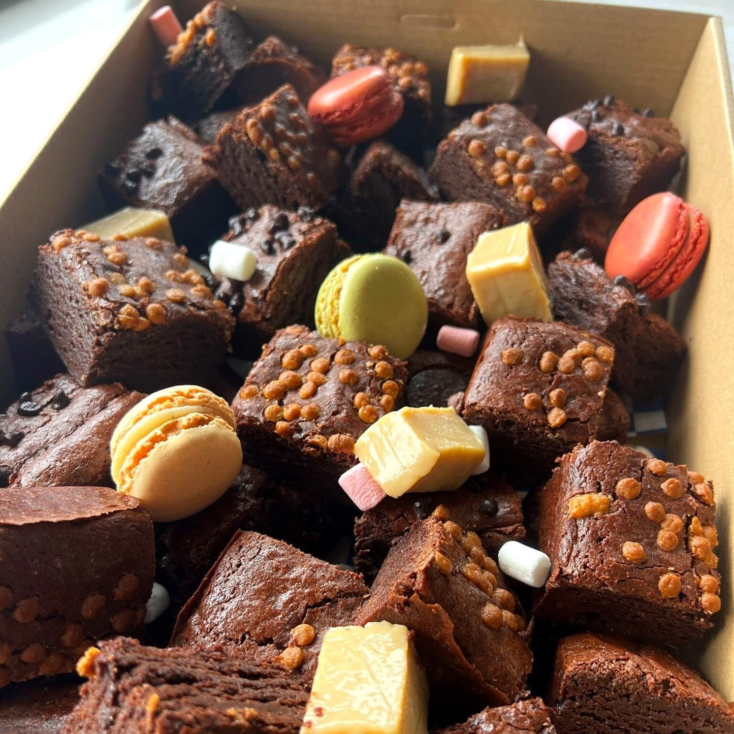 Inside you'll find a mix of our popular original choc chip brownies, handmade fudge like your grandma used to make, delicious macarons, and a sprinkle of mini mallows- all beautifully arranged in a clear-topped catering box.